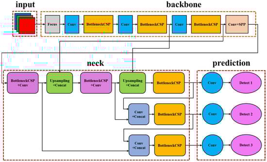YOLOv5 [24] uses many novel skills, such as the image data enhancement method of the Mosaic, adaptive image scaling, and Focus structure. Using these skills can significantly improve the capability of object detection. Mosaic can significantly improve the detected effect of YOLOv5 in small objects by splicing and randomly scaling the picture. Object detection uses image scaling to adjust the length and width of the input image during inference. It calculates the scaling ratio based on the long side, which can effectively reduce the length of the short side to reduce the amount of computing and improve the inference speed. The Focus structure increases the amount of computing for slicing and combining so that the feature map will not lose feature information due to compression. The YOLOv5 model consists of input, backbone, neck, and prediction, as shown in Figure 2.