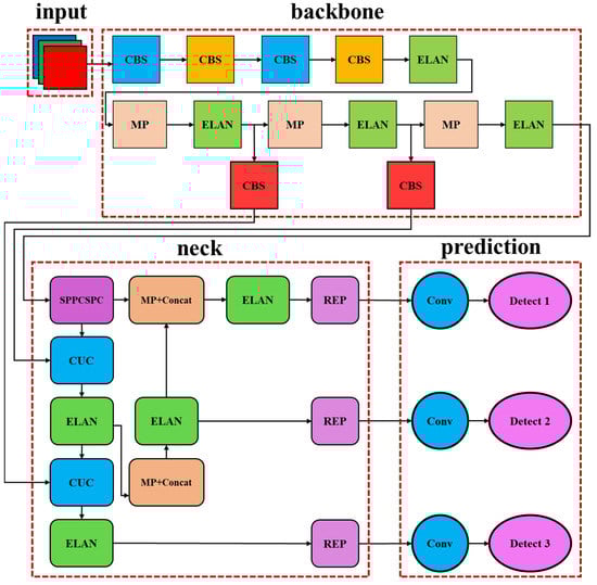 In the backbone, the CBS layer is the basic convolutional unit, including convolution, batch normalization, and SiLU activation functions. The ELAN layer consists of multiple CBS structures, and its feature map output consists of three parts. Here, the feature map is equally divided into two groups by channel. Then, the first group implements five convolution operations to obtain the first part, the second group implements one convolution operation to obtain the second part, and the third part is composed of the results of the first convolution and the third convolution of the first group. The MP layer divides the feature map into two groups. The first group executes maximum pooling to extract more critical information, and the second group conducts convolution to extract the feature information. Finally, combining two groups obtains the result.