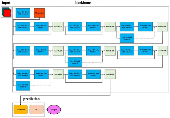 ResNet models [4] can solve this degradation problem. ResNet has five versions: Res18, Res34, Res50, Res101, and Res152. Each version of ResNet includes three parts: input, output, and intermediate convolutions, where the intermediate convolutions consist of four stages from stage #1 to stage #4. Although there are many variants of ResNet, they all follow the above-mentioned structural characteristics. The difference between the networks lies mainly in the differences in the block parameters and the number of intermediate convolutions. To achieve the fastest response time for the inference, we use ResNet18 for image recognition, as shown in Figure 4.