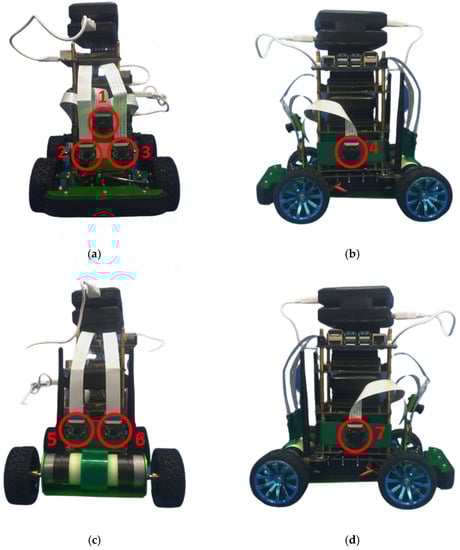 Onboard cameras surrounding a JetRacer. (a) Three front cameras indicated #1, #2, and #3. (b) Left camera indicated #4. (c) Two rear cameras indicated #5 and #6. (d) Right camera indicated #7.