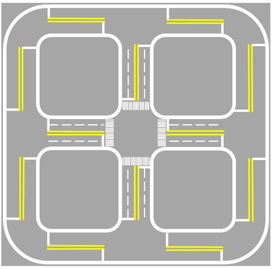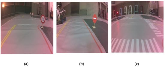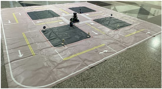 We designed a scenario that let JetRacers self-drive on a planar road map that simulates real roads for the simulation and test of autonomous driving, as shown in Figure 6. Furthermore, this study also produced small-size traffic signs such as speed limit signs, turn signs, stop signs, and traffic lights. JetRacer can drive on a planar road map and follow traffic signal rules, as shown in Figure 7.