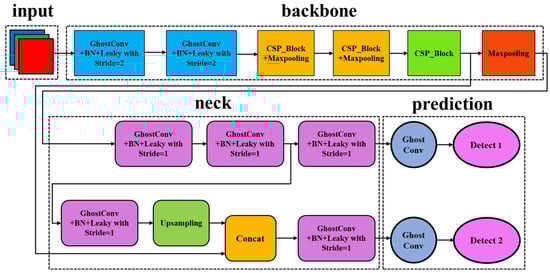 The architecture of the LW-YOLOv4-tiny model. (Different color means different function performed in a single block).