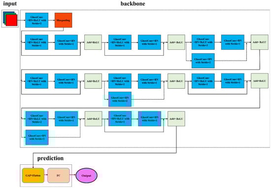 The LW-YOLOv4-tiny model comprises input, backbone, neck, and prediction, as shown in Figure 10. They replace traditional convolutions with Ghost convolutions [28] in their parts. The LW-YOLOv4-tiny model differs from the YOLOv4-tiny model, in which we use ghost convolutions instead of a traditional one and thus shorten the response time of inference intuitively. This approach will reduce the number of visual computations and enhance the ability of feature extraction to improve the inference speed without scarifying the recognition precision. The LW-ResNet18 model comprises input, backbone, and prediction, as shown in Figure 11. It has improved the inference speed like the LW-YOLOv4-tiny model to shorten the response time of the inference without sacrificing the recognition precision.