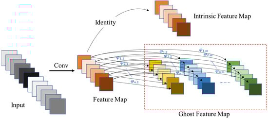 When the traditional convolutional layer performs feature extraction, the CNN-related model uses a set of filters, specifically 3 × 3 and 5 × 5 filters, to proceed with the convolution operations with the input image, and redundant information will also exist in these feature maps. Ghost convolution uses a set of ghost modules consisting of multiple network parameters () to perform feature extraction. This set of ghost modules executes simple linear transformation on intrinsic feature maps through network parameters , and can generate ghost feature maps without complicated convolution operations, as shown in Figure 12. Algorithm 1 shows the ghost convolution algorithm. In Algorithm 1, intrinsic feature maps are feature maps that are calculated by traditional convolution. Then, intrinsic feature maps use ghost modules to generate more ghost feature maps through a series of simple linear transformations. The ghost feature maps can fully reveal feature information hidden in intrinsic feature maps.