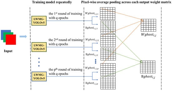 In the training phase, the CNN-related model uses the steepest gradient descent algorithm to continuously update the weight matrix and the bias matrix , achieving the best results of matrixes. The weight matrix and the bias matrix , which are obtained from a single round of network training, are not necessarily reliable, so this study proposes pixel-wise average pooling to obtain a more reliable and , as shown in Figure 13. Assuming that there are rounds of training, each training carries out for epochs. When the training runs out of all epochs for each round, it can obtain the final weight matrix (), and the final bias matrix (). After rounds of network training, the training process will perform pixel-wise average pooling on the weight matrixes and bias matrixes, and the average value of the corresponding element positions in weight matrices and bias matrices can obtain a more reliable and . The linear transformation that such ghost convolution uses can extract features with more precision and obtain higher prediction accuracy for subsequent inferences.