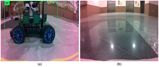 The controller operated JetRacer to move on the road map in small increments for data collection. By collecting images from different angles at each point on the path, the autonomous driving system can learn how to correct the lane. The wide-angle camera mounted on the front of JetRacer has a 140-degree viewing range. Data collection from this camera can help JetRacer move along the route more accurately, as shown in Figure 8. This study needed to collect two datasets. The first dataset contains various objects, such as vehicles and different traffic signs, and the second includes the routes of the planar road map. To implement the object detection task, we needed to manually label the first dataset, as shown in Figure 9.