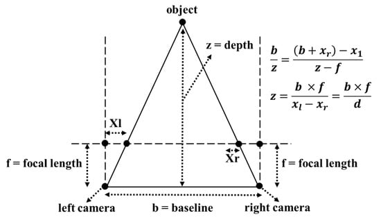 In Figure 14 and Figure 15, LW-YOLOv4-tiny proceeds with object detection in the real-time video streaming captured from the dual cameras located in the front and rear panels of JetRacer. This study uses visual odometry to measure the distance between the vehicle and the target object, as shown in Figure 16. The triangle theorem and the principle of parallax can estimate the distance between the detected object and the center point at the horizontal line spanned dual cameras, as shown in Figure 17. However, there are some restrictions on the use of dual cameras, including the fixed distance between the dual cameras and the build of the dual cameras on the same horizontal line. Otherwise, they will significantly affect the accuracy of measuring distance.