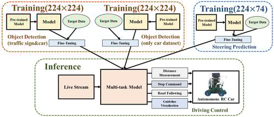 In contrast, the proposed autonomous driving system is implemented on a small-size model car. Several studies [10,11,12] used Raspberry Pi as the computing platform to run the autonomous driving system. Nevertheless, this study applied Jetson Nano with powerful functions to implement the autonomous driving system. In addition, we proposed the integration system to perform object detection and steering angle prediction simultaneously.