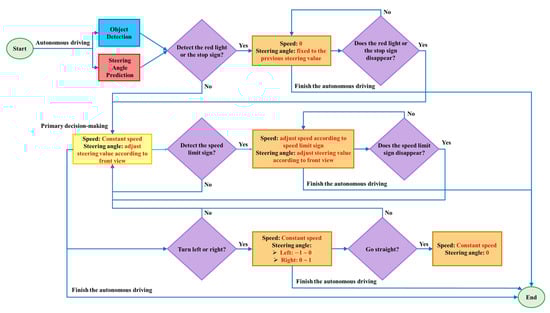 Typically, steering angle prediction and object detection will run continuously across the planar road map. An autonomous driving system needs a mechanism that requires information fusion between the two processes during the driving of the model car. First, when the object detection has recognized a red light or a stop sign in front of the model car, the Jetracer will brake accordingly. If the steering angle prediction has decided to turn left or right at that time and the driving system does not ignore this action, it will cause the Jetracer to be stationary, but its front wheels will move left and right, as mentioned above. Next, when the object detection recognizes the speed limit sign, the system should adjust the driving speed of the Jetracer according to the speed limit. Then, there is the decision to turn left or right. Jetracer has to maintain a constant speed to avoid the doubt of insufficient corner entry. Finally, there is the decision to go straight. The steering value should be fixed at 0 so that the Jetracer can stably go straight on the straight road. Therefore, the autonomous driving system takes information fusion to deal with the contradiction problems caused by inconsistent driving decision-making. Figure 21 shows the decision-making performed by Jetracer in various scenarios to avoid unreasonable driving behavior.