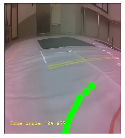 According to the steering range on the real-time image in the form of a JetRacer, the autonomous driving system creates a green dot line that presents visualized steering assistance for guiding the imminent turning direction of a JetRacer, as shown in Figure 22. The purpose of visualized steering assistance is to remind the driver of a forecast of the imminent turning direction of a JetRacer. When the autonomous driving system deviates, and the JetRacer is about to deviate from the lane, manual driving by the driver can cause the JetRacer to return to the original lane, which ensures a safe drive.
