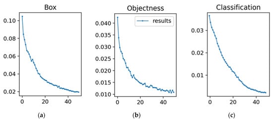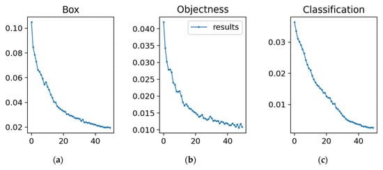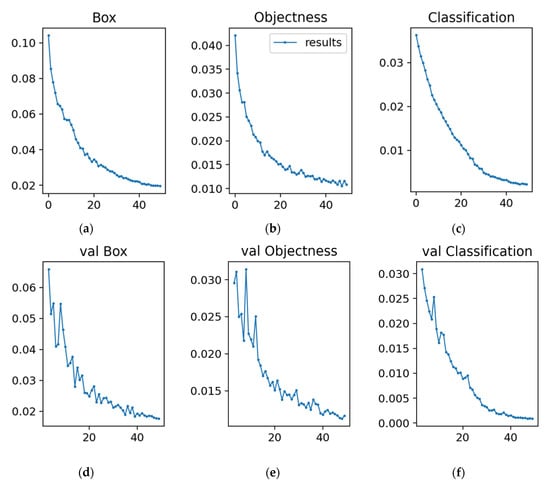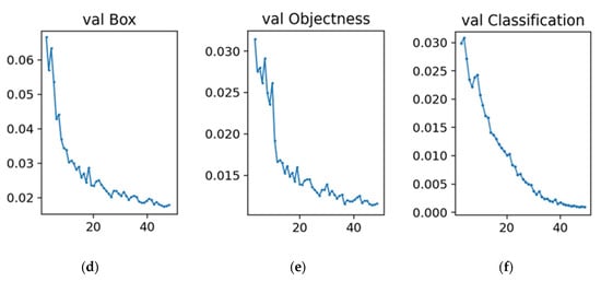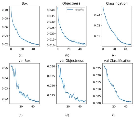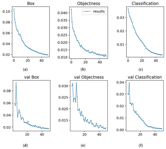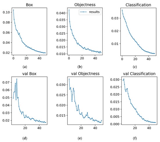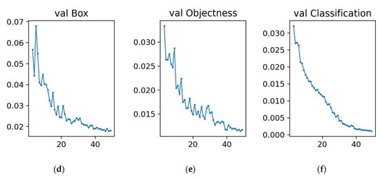 Training and validation losses of the YOLOv5n model. (a) Box training loss. (b) Objectness training loss. (c) Classification training loss. (d) Box validation loss. (e) Objectness validation loss. (f) Classification validation loss.