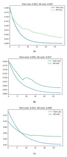 After 30 training epochs, we used the visualization tool to observe the training process and the callback function to save the best-performance model. There are three loss plots for every steering angle prediction model, as shown in Figure 29. In Figure 29, the blue line represents the training loss, and the green line represents the verification loss. LW-ResNet18 model can reduce the verification loss to 0.034, ResNet18 model 0.037, CNN model 0.048, and Nvidia-CNN model 0.067.