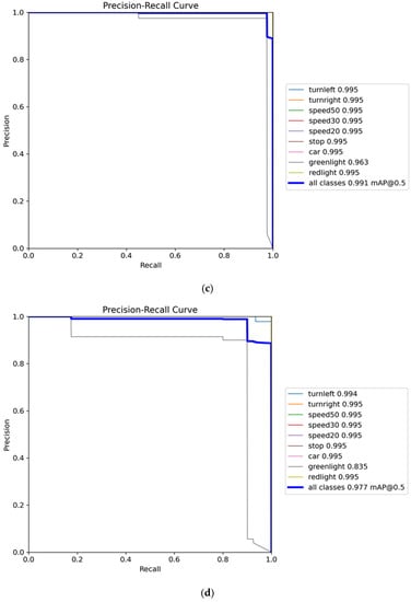 Here, we will evaluate the execution speed and precision of every object detection model. After the models were trained with the same parameter settings, the experiment tested the trained models with 366 images and plotted the PR curve results, as shown in Figure 30. In the test, Equation (2) computes the execution speed FPS, and Equation (3) evaluates the precision mAP, as listed in Table 8. In Figure 30, the PR curve takes recall as the x-axis and precision as the y-axis, and each point represents a combination of recall and precision. Next, we can obtain an AP by averaging all precisions retrieved from the combinations. The mAP is the sum of the APs from all categories in the PR curves and then divided by the total number of categories. In Table 8, YOLOv5s achieve the best precision, and YOLOv7-tiny achieves the least.