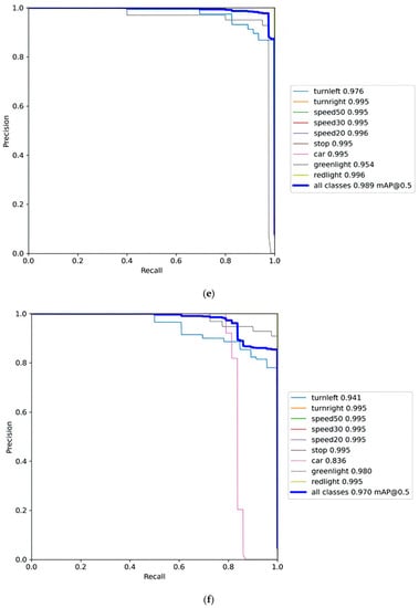 The precision–recall curve for the object detection model. (a) LW-YOLOv4-tiny; (b) YOLOv4-tiny; (c) YOLOv5s; (d) YOLOv5n; (e) YOLOv7; (f) YOLOv7-tiny.
