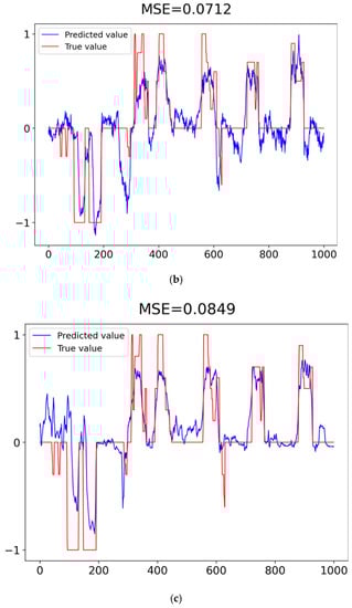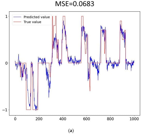 Here, we will evaluate the execution speed and accuracy of every steering angle prediction model. After training the models with the same parameter settings, the experiment tested the trained models with 1000 identical images and plotted the predicted and actual values, as shown in Figure 31. In the test, Equation (2) computes the execution speed FPS, and Equation (4) evaluates the prediction accuracy MSE, as listed in Table 9. In Figure 31, the red line represents the actual steering value, and the blue line is the predicted steering value. We predefined the turning value limited between −1 and 1, where −1 means turn right, 1 means turn left, and 0 means go straight. In Table 9, the LW-ResNet18 model obtains the smallest MSE, and the Nvidia-CNN model achieves the biggest .