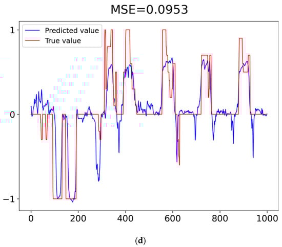 Predicted and actual values of steering angle prediction model. (a) LW-ResNet18; (b) ResNet18; (c) CNN; (d) Nvidia-CNN.
