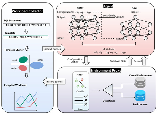 FASTune consists of three parts. First, Agent interacts with the Environment Proxy and recommends configurations. Agent is a Soft Actor–Critic (SAC) [51] network containing two independent neural networks: actor and critic. Actor takes multi-state as input and outputs an action (i.e., configurations), and the Proxy computes a reward based on the evaluation of action. Critic takes multi-state and action as input and outputs a Q-value (score). Critic updates according to the reward, and actor updates according to the Q-value. Details of SAC will be discussed in Section 4. Second, the Environment Proxy contains three components—(a) Filter using rules and machine learning methods to exclude dangerous action for safety tuning. (b) Virtual Environment alleviates the burden of evaluating the action in tuning. (c) Dispatcher receives the action and deploys it to environment or sends it to Virtual Environment. Third, Workload Collector records recently arrived workloads and predict the expected queries in the future. The interactions between Agent and Environment Proxy generate trajectories stored in memory; trajectories are a set of tuples . is the feature of predicted future workload, and represents database state such as , etc. A is an action generated by Agent, and r is the reward of action calculated from throughput and latency. Note that, different from existing methods, and are combined and provided to the agent as multi-state.