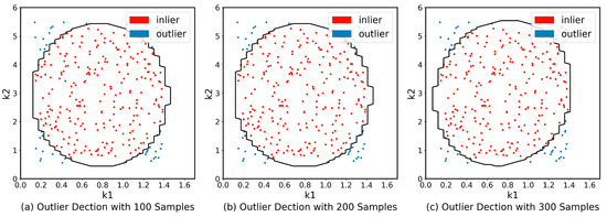 Data points that are above the threshold (i.e., outside the ellipse) are identified as outliers and are considered to be significantly different from the other data points in the dataset. Note that, The Accurate MCD estimator is hard to compute since it requires the evaluation of all subsets [61]. The FAST-MCD [62] algorithm is borrowed to improve the estimator’s speed. Figure 3 shows the outlier detection results. There are 71 dimensions in action and we choose two for visualization.