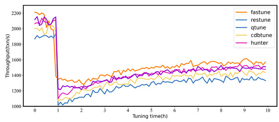 Workload first holds on Sysbench (RO) for one hour, and then switches to Sysbench (RW). The workload drift causes a performance degradation, and all throughput drops below 1200 txn/s except for FASTune. FASTune suffers the least from the drift because FASTune predicts workload drift and adjusts in advance. Note that FASTune has experienced a slight performance degradation as a by-product ahead of the drift. Another potential advantage of FASTune is that FASTune can provide warning before workload drift arrives. We would like to implement this feature in future work.