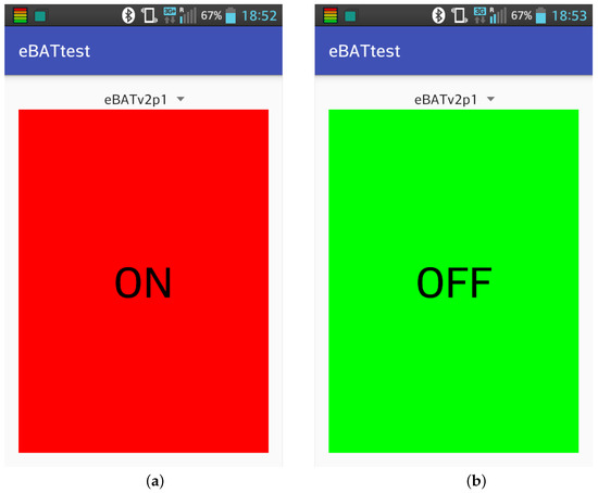 View of the application developed for the eBAT. (a) OFF state in the left panel. (b) ON state in the right panel.