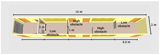 Diagram of the 16 m long by 2 m wide corridor, with the obstacles every 3.2 m. It is possible to travel the same in both directions.