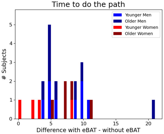 In the case of time spend for the route, the obtained average difference was 7.5 s between the case of not using the eBAT and its use, which represents an average increase of 20% in the time needed. The histogram obtained divided by sex and age groups is shown in the graph of Figure 6.