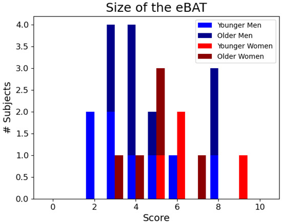 Histogram of the answers about the eBAT size perception of the volunteers. Data are presented divided by sex groups and median age.