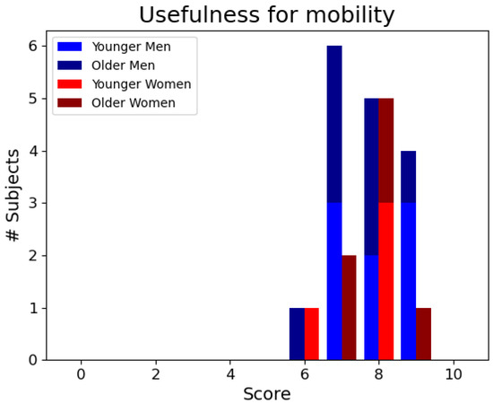 Histogram of the scores about the usefulness of the eBAT for the mobility. Data are presented divided by sex groups and median age.