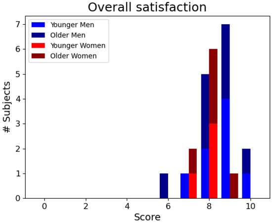 Finally, the histogram with the scores for the total satisfaction with the eBAT divided by sex and age groups is shown in Figure 11.