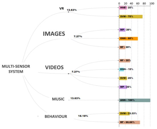 Regarding the algorithms, the most used by the authors are artificial neural networks (ANN), convolutional neural networks (CNN), or dynamic neural networks (DNN), especially when the emotion activation stimulus is images and the EEG response is evaluated. For multisensor devices with ECG, GSR, blood pressure variability (BPV), EDA signals, the most used have been decision tree (DT), K-nearest neighbor (KNN), random forest (RF), and support vector machines (SVM), and with these last two, the highest percentages in classification have been achieved. Multilayer perceptron (MP), Hoeffding tree (HT), and naïve Bayes (NB) are also used in a minority of cases.