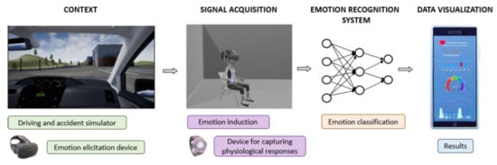 The main goal of this work is to combine the use of these sensors with the possibilities offered by VR to create a system for recognizing the stress of an individual during different driving situations in a vehicle. The combination of visual and audio stimuli and the possibility of interaction and total immersion of the user in a three-dimensional environment enhance the realism and impact of emotional stimuli [16,17,18]. Thus, an innovative method of learning and stimulus induction is proposed, which safely circumvents space and time constraints through VR head-mounted display (HMD) , that is a 3D visualization device. This technology allows users to immerse themselves in purpose-built virtual spaces, recreate scenarios that are very difficult or even impossible in real life, such as, in this case, an accident, and users can even interact and manipulate objects freely and safely, using controllers or other technologies such as eye-tracking or motion sensors [17]. The use of VR technology to elicit emotions has been shown to increase and stimulate the physiological responses of subjects as the results obtained consisted of an increase in the mean electrodermal activity (EDA) and heart rate (HR) compared to a standard or non-immersive (2D) simulation during a driving simulation [19].