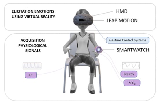 A commercial smartwatch was used to acquire PPG and respiration data, which has been found to be effective for the recognition of basic emotional states [9,20]. The smartwatch collects information from HR, oxygen saturation (OS), and heart rate variability (HRV), from which time and frequency features are extracted to select the most suitable ones for the emotional classification algorithm. The Leap Motion hand-tracking device was used to observe the participants’ movements during the simulation.