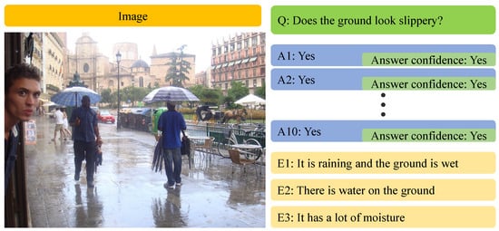 Deep learning has advanced rapidly in recent years, resulting in the practical application of artificial intelligence systems in various scenarios, and having a significant impact on society []. Since a multi-step reasoning task involves computer vision (CV) [] and natural language processing (NLP) [], visual question answering (VQA) [] has become one of the most important areas of development for detecting defects in flow lines [] and for complementary diagnostics [,]. Because these applications are directly related to the safety of people’s lives and property, new regulations have been introduced, requiring model reliability and increasing the demand for model interpretability [,]. While current VQA methods primarily focus on performance improvement, they remain as black boxes, lacking transparency in their question-answering processes. As a result, they may not meet users’ reliability requirements. Furthermore, if a model generates an incorrect answer, there may be no explicit method to improve the predictions if the model’s prediction logic is not understood.