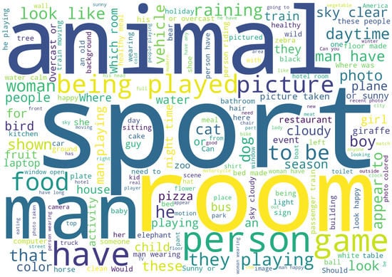 Word cloud of all questions in our dataset. The font size represents the frequency of occurrence in the dataset. The most frequent occurrences are “sport”, “animal”, and “room”.