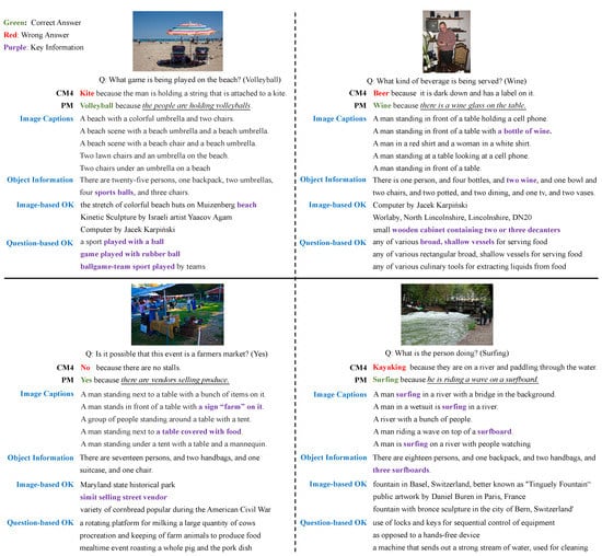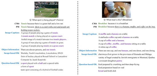 In our previous works [,], we introduced image captions and caption-based outside knowledge as novel modalities to improve model performance. However, the generated caption in Figure 1 highlights the limitations of our previous works. There are generated captions that have little relevance to the question, making them inappropriate as references for answering. Furthermore, the outside knowledge retrieved by the caption is uniformly unavailable as a reference.