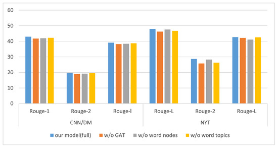 - On different datasets, the gains of word nodes and topic nodes were different. Specifically, on the CNN/DM dataset, removing the word nodes led to more significant performance degradation than removing the topic nodes. However, on the NYT dataset, retaining topic nodes led to better performance in the ROUGE-1 and ROUGE-2 scores. The reason for this phenomenon may be due to the different styles of articles in the two datasets: articles in the CNN/DM dataset are usually more concise and clear, focusing on factual statements and objective reporting, while articles in the NYT dataset focus more on in-depth reporting and critical analysis. For these reasons, we speculate that incorporating implicit topic information is more advantageous for generating complex article summarization.