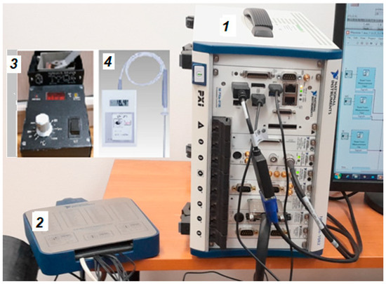 Basic operations in all measurement channels in the developed virtual instrument are performed in software on digital data. Its configuration is shown in Figure 1. The instrument is based on the NI PXI measurement platform 1 with a user interface (screen, keyboard, and mouse) and NI terminal block 2 cooperating with a set of thermistors. The temperature information is obtained from the thermistors and is further processed in the NI LabVIEW environment. A temperature calibrator 3 (T-704 Mors, Gdynia, Poland) was applied to set specific temperatures during the calibration of measurement channels and during the testing of their properties. The digital temperature meter 4 (DT-34 [40]) was used as a reference instrument to verify the temperature setting.