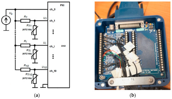 The NI SCB-68A terminal block [44] provides a shielded I/O connection for interfacing I/O signals to a plug-in data acquisition device (DAQ card) with a 68-pin connector. The NI terminal block 2 (Figure 1 and Figure 2b) is used for the acquisition of measurement data from all active channels. The voltage dividers (Figure 2a) form the RTi thermistor conditioning circuits in the individual channels and are mounted on the PCB inside the NI terminal block, adapted to the assembly of additional elements. The Ri resistors in each measuring channel i perform an auxiliary function, ensuring that the DAQ input voltages Ui change with changes of each resistance RTi according to the following relationship: