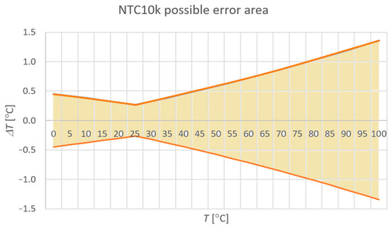 NTC10k thermistors, hermetic miniature sensors with a resistance of 10 kΩ at a temperature of 25 °C, were used as temperature sensors in the developed measuring system. The manufacturer of the NTC10k thermistors under consideration declares in the datasheet [49] that the sensor RT resistance at 25 °C is 10 kΩ ± 1%, and its coefficient β is 3380 K ± 1%. The error area resulting from the permissible dispersion of these parameters, using Formula (3) to determine the temperature, is shown in Figure 3. The combination of the permissible deviations of the thermistor resistance and the material constant β, according to the manufacturer’s data, creates a plane of permissible errors in determining the temperature with the thermistor in the given temperature range. This means that for temperatures in the range of 0–100 °C, the temperatures determined by individual sensors may differ from the actual temperature by the value of ΔT, located in the area limited by colored lines in Figure 3. These considerations do not take into account other factors contributing to measurement errors.