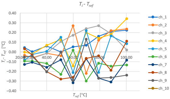 The quality of determination of characteristics of the measuring path depends largely on the accuracy of the stabilization of the reference temperatures during the calibration procedures of the track elements. Since the resolution of the NI DAQ card [43] used in the system and its accuracy, as well as the procedures for programming the measurement paths have been verified in numerous tests, the main emphasis in the calibration procedures of the measurement system should be on precise temperature stabilization and ensuring good thermal coupling of all sensors in the temperature calibrator. Residual errors observed as variations in the temperature error curves in the measurement channels (Figure 6) may be the result of temperature differences in the thermal calibrator chamber in which the tested sensors were located together, both at the stage of identifying the processing characteristics in individual channels and during verification measurements. The level of these errors is quite low compared to the results of other studies, e.g., described in [26].