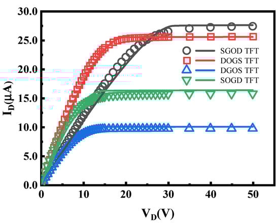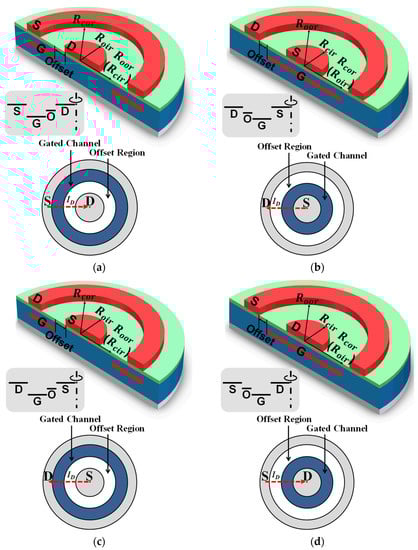 According to the position of the offset region to the drain electrode, offset Corbino TFT can be classified into Drain-Offset Corbino TFT and Source-Offset Corbino TFT, in which the offset locates at the drain side and source side, respectively. The electrical characteristics of Corbino TFT vary when choosing the inner or outer ring electrode as the drain. Therefore, Drain-Offset Corbino TFT can be further divided into Source-Gate-Offset-Drain TFT (SGOD TFT) and Drain-Offset-Gate-Source TFT (DOGS TFT). Source-Offset Corbino TFT can be further divided into Drain-Gate-Offset-Source TFT (DGOS TFT) and Source-Offset-Gate-Drain TFT (SOGD TFT). The three-dimensional cross-sectional structures and top views of the four types of offset Corbino TFT are shown in Figure 1a–d. The inner and outer radiuses of the gated channel are denoted as Rcir and Rcor, and the inner and outer radiuses of the offset region are denoted as Roir and Roor. Due to the coupling of the gated channel region and offset region in offset Corbino TFT, Rcir = Roor can be found in Figure 1a,c, and Roir = Rcor can be found in Figure 1b,d. In addition, we label the length of the gated channel region and offset region as Lchannel (Rcor–Rcir) and Loffset (Roor–Roir). Although SGOD TFTs and DOGS TFTs (also for DGOS TFTs and SOGD TFTs) have the same Lchannel and Loffset, their gated channel and offset region differ due to the rotation symmetry of Corbino TFTs, as shown in the top views. In addition, the direction of the drain current is also different for SGOD TFTs and DOGS TFTs. The charge carriers are injected from the outer electrode to the inner electrode in SGOD TFTs but from the inner electrode to the outer electrode in DOGS TFTs.