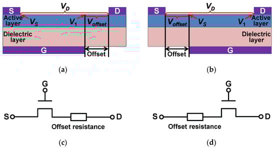 Similarly, Source-Offset Corbino TFT could be equivalent to the series of traditional TFT and offset resistance, as shown in Figure 2d. However, in the case of Source-Offset Corbino TFT, V1 is VD, and VS is IDRoffset in Equation (2). Therefore, we have the current-voltage (I-V) Equation of Source-Offset Corbino TFT in the linear region as: