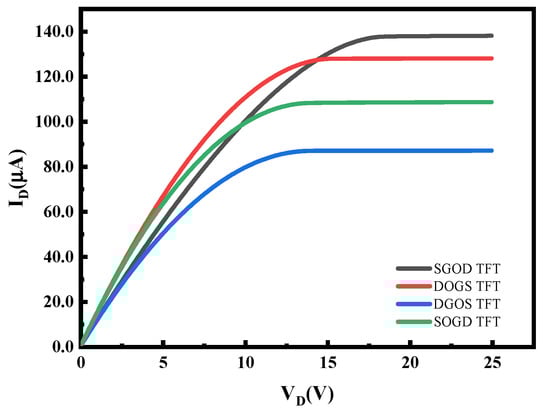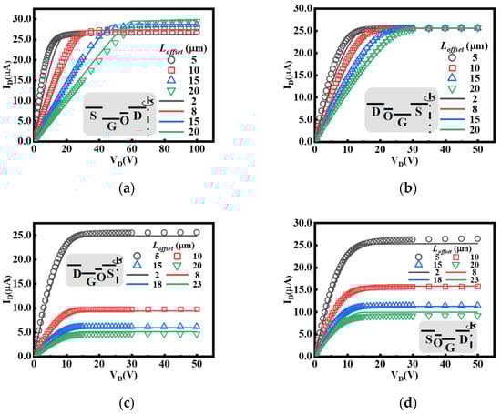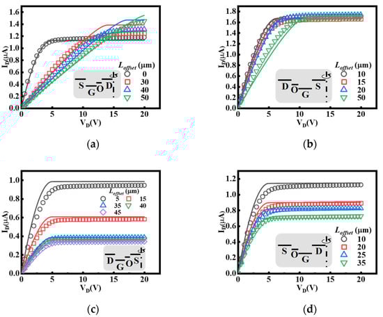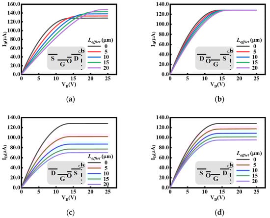 The position of the offset region affects the current–voltage characteristics of offset Corbino TFT, as shown in Figure 4. With the same Loffset and Lchannel, the IDsat of Source-Offset Corbino TFT is smaller than that of Drain-Offset Corbino TFT because the offset in Source-Offset Corbino TFT reduces the saturation current. The DGOS TFT has the lowest IDsat, and the SOGD TFT has the second lowest IDsat. In the formula of IDsat of Source-Offset Corbino TFT, the value of Roffset exists as a denominator. The VDsat and IDsat of SGOD TFT are greater than those of DOGS TFT on account of larger Kn and Roffset, which can be explained directly using the formula of VDsat and IDsat of Drain-Offset Corbino TFT shown in Table 1.
