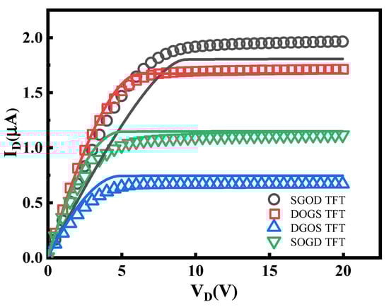 For Drain-Offset Corbino TFT, the experiment results in Figure 8a,b show that the VDsat increases with the Loffset. SGOD TFT with longer Loffset has larger IDsat, and different DOGS TFT almost have the same IDsat despite different Loffset. Despite the slight variance in IDsat, the experimental results verify the theoretical derivation and TCAD simulation, where different DOGS TFT have identical IDsat for different values of Loffset. For Source-Offset Corbino TFT, experimental TFTs with longer Loffset have smaller IDsat. In addition, the VDsat of experimental Source-Offset Corbino TFTs is almost the same despite different Loffset, as demonstrated in the formula. In Figure 9, the regulation of VDsat and IDsat with offset is the same as expected from the theoretical formula and simulation. Overall, the experiment results indicate that our physical model of offset Corbino TFT is reasonable.