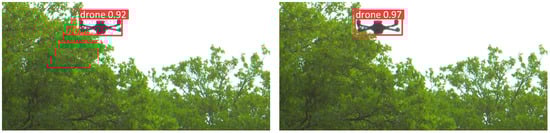 Assessment of the detection accuracy. A comparison of the detection results on real data obtained with model trained solely on synthetic data (left) and model trained on real data only (right). Both models exhibit a comparable level of confidence in detecting the drone.