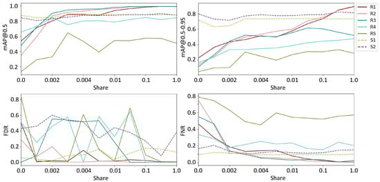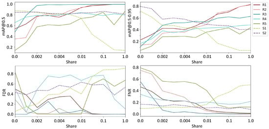 Mixed-Data Training. Analyzing the performance outcome obtained by mixed-training strategies utilizing varying shares of real-world data, as illustrated in Figure 7, reveals dataset-specific variations in performance levels, akin to those observed in fine tuning. However, these variations appear to be less pronounced and more consistent as in fine tuning. For instance, when examining the progression of mAP values for an IoU threshold of 0.5 (see Figure 7, top left), we see a slight increase for R1–R5 when using mixed-data training with small shares of real-world data (≤10%), followed by stabilization at an almost constant level with further increases in real-data shares. The stabilization of the mAP value is contingent upon the respective dataset, exhibiting values between 0.5 and 0.99. The mAP values with respect to datasets S1 and S2 remain almost unchanged as the shares increase. A comparable behavior can be seen in the progression of FNRs, where even minor shares of real data lead to a rapid decline in FN for all datasets except R5 (cf. Figure 7). Dataset R5 exhibits the highest level of FDR and the lowest mAP values, while datasets R1, R2, and R3 record the best results in terms of FDRs and mAPs.