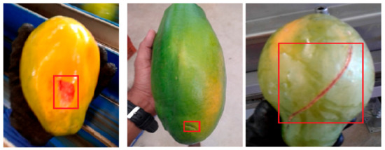 13] created a dataset of 15,179 images depicting 7 diseases/damages that affect papaya, including “anthracnose”, “Phytophthora blight”, “mechanical damage”, “chocolate spot”, “sticky disease”, “physiological spot”, and “black spot”. The images were obtained in situ in a fruit packaging facility in a rural production environment and annotated to depict a single disease in each image. The authors divided the dataset into a training set (12,071 images), a validation set (1554 images), and a test set (1554 images) and employed the Yolov4 detector for the disease detection task. The study reported an f1-score of 80.1% for the disease detection task. However, the dataset’s annotations were limited to depicting a single label in each image, even in cases where the fruit was affected by secondary diseases or multiple instances of the same disease, making it less useful for real-world applications.