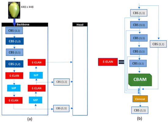 Figure 4 illustrates a simplified view of the backbone of the proposed structure and details the formation of the E-ELAN module where the CBAM modules were inserted. The CBS modules (