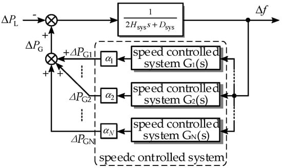 It is difficult to obtain an accurate and simplified mathematical model of the speed control system using the traditional ASF model. Ref. [] proposed a low-order general model of the generator speed control system that fully considered the frequency response characteristics by establishing a general average system frequency (G-ASF) model. The G-ASF model is shown in Figure 2.