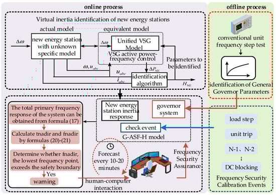 Figure 7 shows the flowchart for the application of the G-ASF-H model to the online frequency security assessment. First, the frequency step test of the speed control system was performed offline to obtain the mechanical power response curve, thereby identifying the parameters of the general speed control system and avoiding the repeated analysis of the speed control system during operation. At the same time, events are also very important for frequency safety assessment. Offline predefinition of frequency safety verification events should include emergencies that have a large impact on the system frequency stability, which can be a 3% to 10% load step, bulk infeed HVDC system, generator trip, or typical N-1 or N-2 events, such as an active power deficit [,].